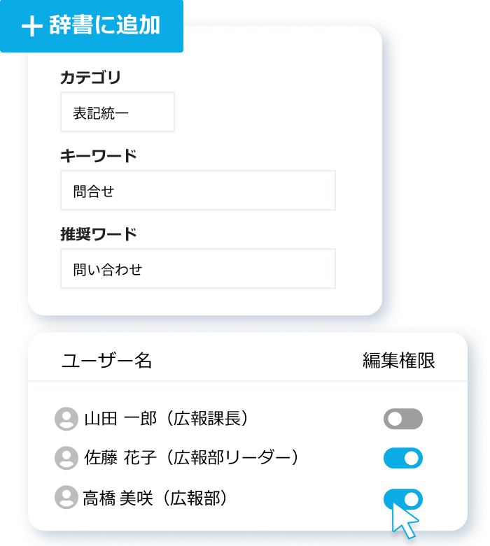 たとえば「特定の部署内ではNGとなっている言葉」や「社内では独自の定義を持つ言葉」を追加すれば、チームや組織の言葉・表記ルールの統一が期待できます。