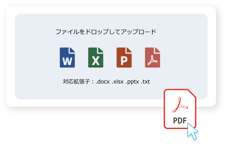 - 対応形式:Word(.docx)、 Excel(.xlsx)、PowerPoint(.pptx)、PDF(.pdf)、TXT(.txt)